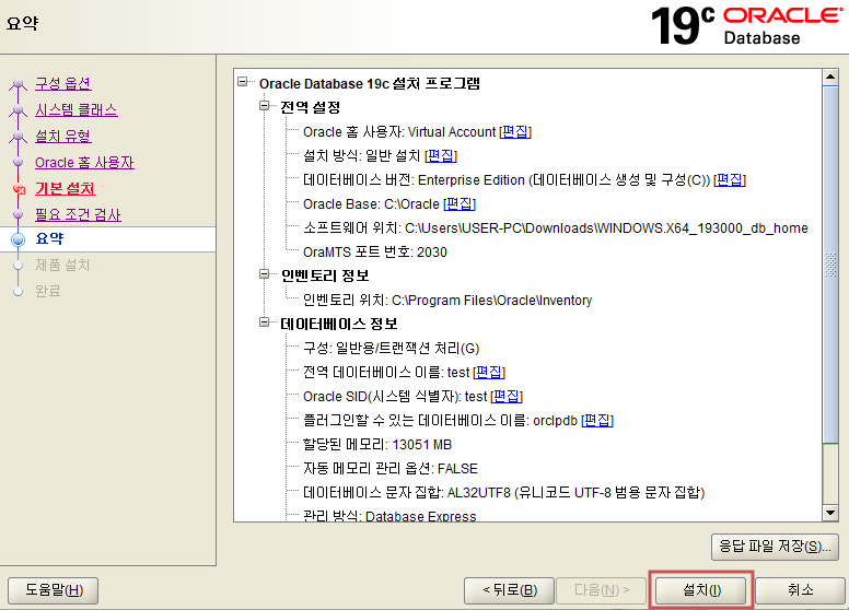 경로 설정 및 DB이름, 비밀번호 작성(메시지 뜨는 경우 신경 쓰지 말고 '예' 눌러서 스킵)